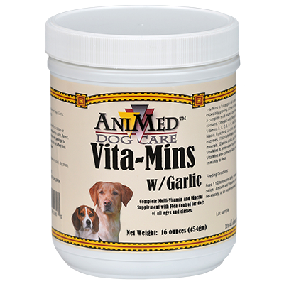 A complete multi-vitamin and mineral supplement that contains; Omega 3 and 6 fatty acids, vitamins A, C, D, E, H, K and B-complex, biotin, niacin, folic acid, lecithin, and more. Plus 11 enzymes, 11 carbohydrates, 14 fatty acids, 18 minerals, 22 amino acids, and 59 trace elements. Vita-Mins is an excellent source of additional protein. Vita-Mins also contains garlic; for dogs of all ages and classes, especially growing, active or older dogs.