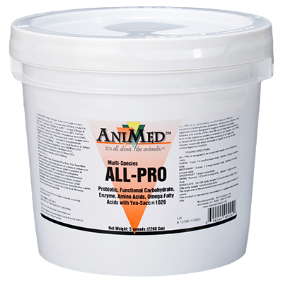 An advanced fusion of all-natural, premium, functional carbohydrates; probiotics; enzymes; active yeast cultures; and digestive factors designed to support the proper balance and activity of naturally occurring digestive microflora in the digestive system. ALL-PRO is beneficial for horses of all ages and classes, containing both prebiotics and probiotics, especially during periods of stress and changes in hay or feed quality.