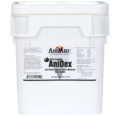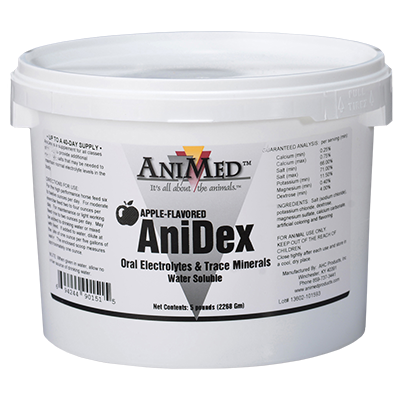 Formulated to provide additional oral electrolyte salts and trace minerals to support electrolyte balance. AniDex is designed for all classes of hard-working horses and is also available in three flavors: apple, cherry and orange.