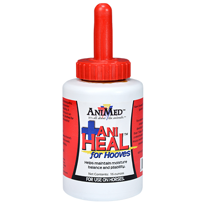 A powerful penetrating hoof dressing formula, developed by a veterinarian, containing homeopathic arnica. AniMed’s AniHeal™ for Hooves is designed to help maintain normal moisture balance and pliability within a horse’s hooves. AniHeal™ for Hooves is for all classes of horses and may be used in all weather conditions. Brush cap bottle provides easy brush-on application.