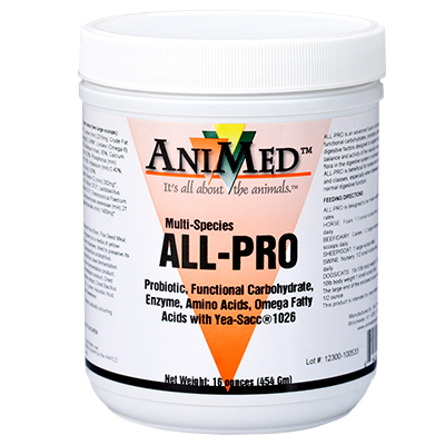 An advanced fusion of all-natural, premium, functional carbohydrates; probiotics; enzymes; active yeast cultures; and digestive factors designed to support the proper balance and activity of naturally occurring digestive microflora in the digestive system. ALL-PRO is beneficial for horses of all ages and classes, containing both prebiotics and probiotics, especially during periods of stress and changes in hay or feed quality.
